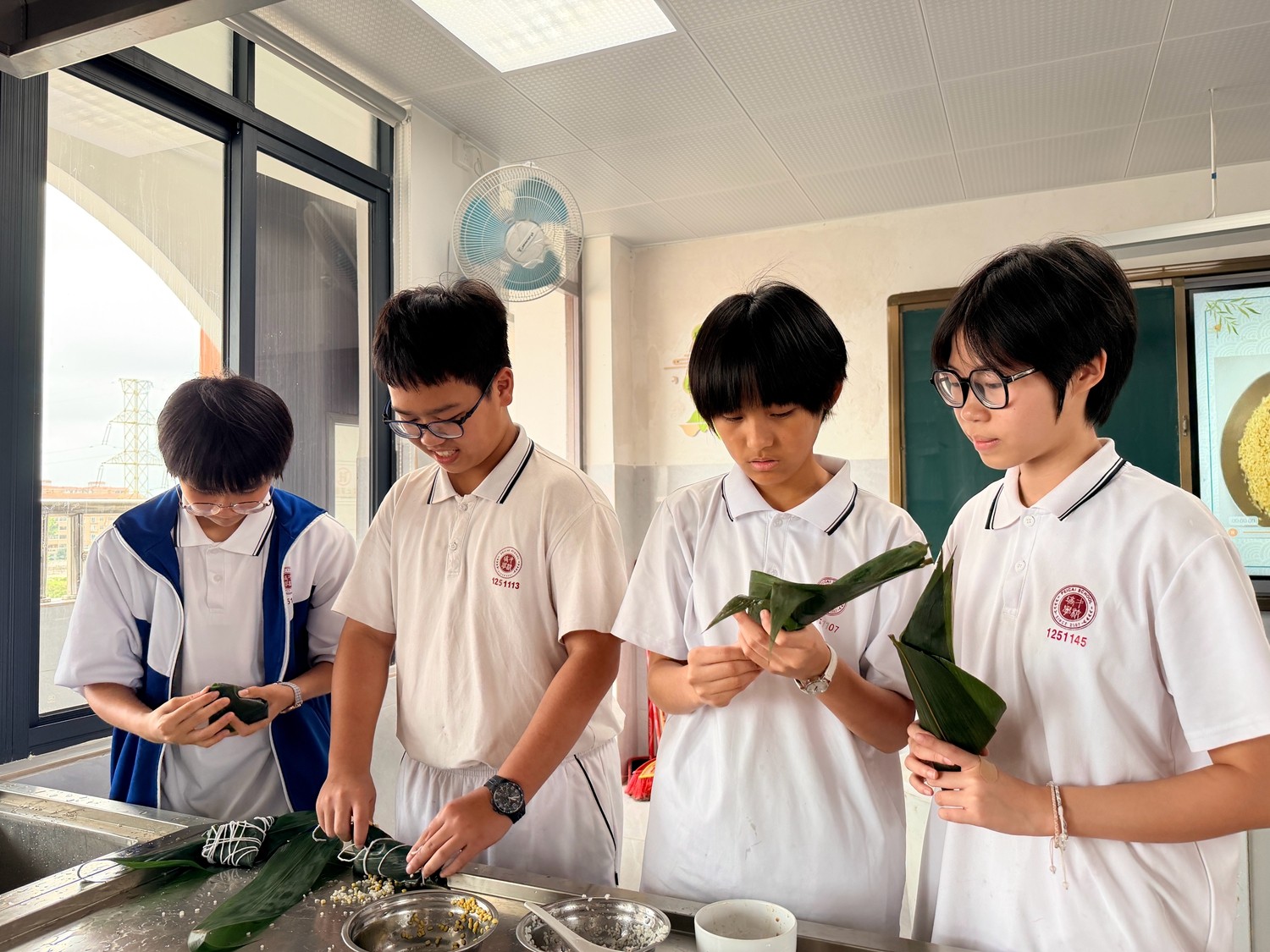 为了让同学们更好地掌握制作技巧,老师结合图文和实物演示,帮助同学们学习包制粽子的步骤和手法:从粽叶的挑选,到糯米的浸泡、调味,再到馅料的搭配、包裹的手法,以及最后的捆扎技巧。同时,还分享了湛江粽子的民俗故事,让同学们在学习技艺的同时,深入了解本土文化,厚植乡土情怀,课堂上同学们认真聆听、积极提问,主动记录制作要点,对接下来的实践环节充满期待。